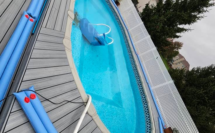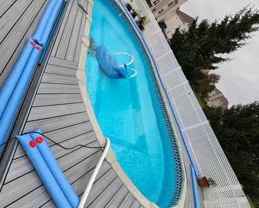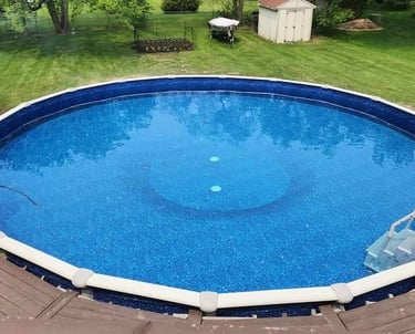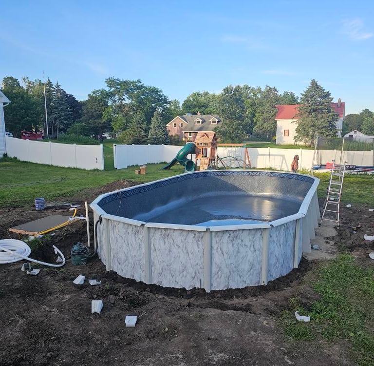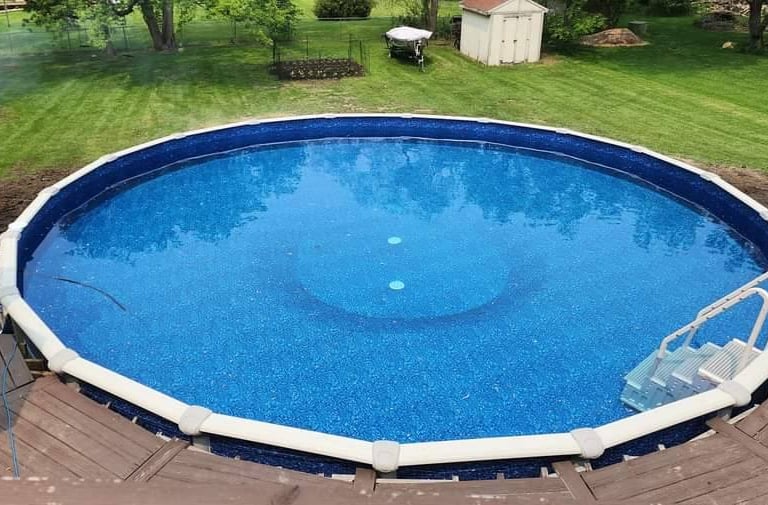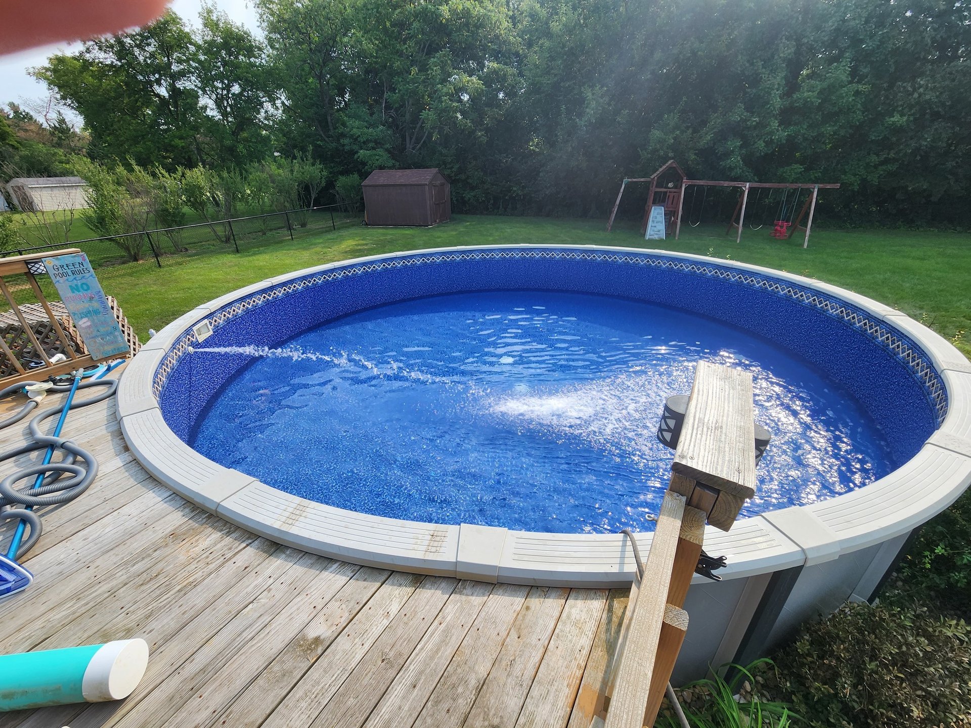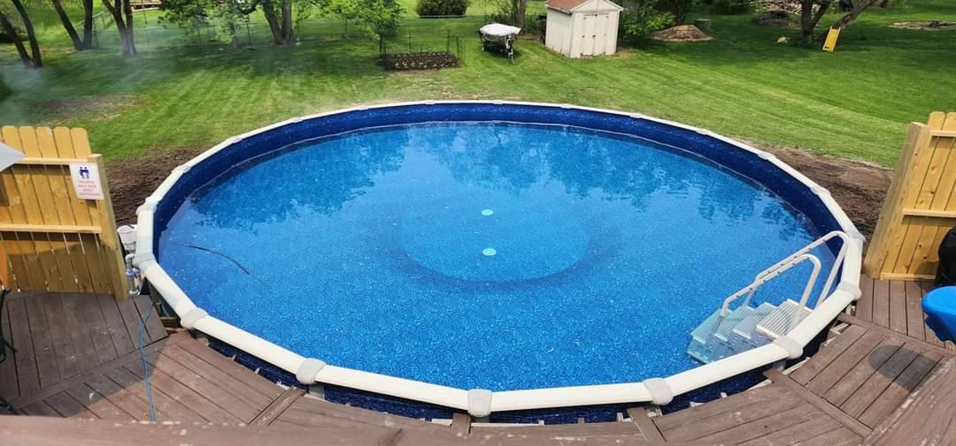An above ground pool surrounded by green lawn, perfect for kids and adults alike, featuring easy access steps!